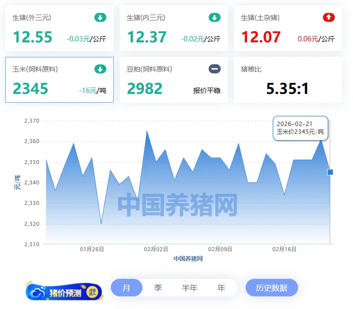 2026年02月21日-中国养猪网 全国玉米价格走势图及涨跌表