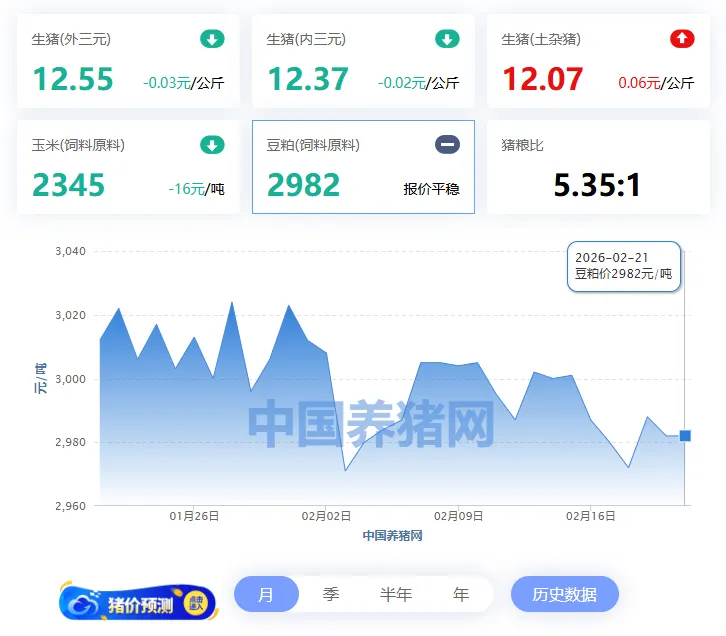 2026年02月21日-中国养猪网 全国豆粕价格走势图及涨跌表