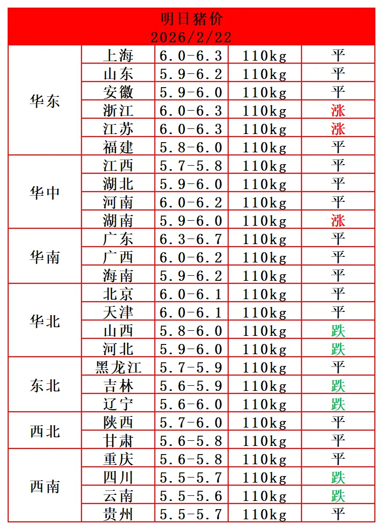 2026-2-22日猪价(明日猪价) 养羊网 2026-02-21 2026-2-22日猪价(明日猪价)立马收到明日猪价! 养羊网 2026-02-21 上一篇:2月22日南宁鸡蛋参考价格:祝大家初六《六六大顺,生意兴隆,财源广进!》 下一篇:榆林鸡蛋报价|2月22日 您可能还会对下面的文章感兴趣111: 相关文章 2026年 2月4日全国鸡蛋价格 2025年4月13日全国各地生猪价格信息 难道说,第一天就要完成月目标了?! 2025年4月13日全国各地生猪价格信息