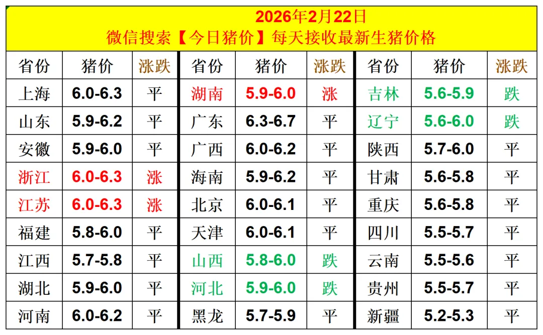 今日猪价|明天猪价分析2026.2.22 养羊网 2026-02-22 今日猪价|明天猪价分析2026.2.22关注我们,早点知道猪价 养羊网 2026-02-22 上一篇:明日猪价 2026.2.22 下一篇:养羊和养猪 您可能还会对下面的文章感兴趣111: 相关文章 泰国应该承诺吗?真的有用吗? 猪价拉响“春节警报”!南北博弈陷入僵局,养猪人该压栏还是抛售 来自榆林的本土养殖大户,6不喂必须会! 近期价格更新!!!