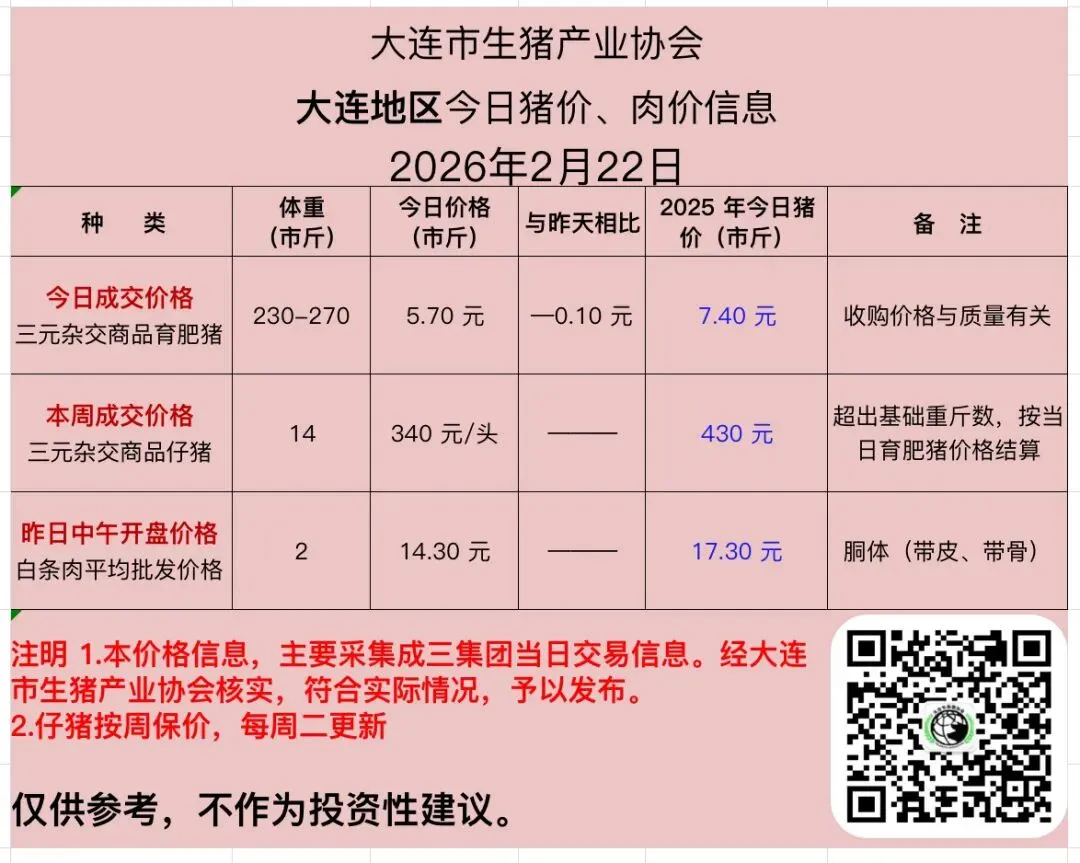 2026 年 2 月 22 日猪价、肉价信息 养羊网 2026-02-22 2026 年 2 月 22 日猪价、肉价信息天天报价大连市生猪产业协会 养羊网 2026-02-22 上一篇:2026.02.22鸡蛋价格行情 下一篇:2月22日绿壳鸡蛋价格参考 您可能还会对下面的文章感兴趣111: 相关文章 2026年2月7日 ?全国最新鸡蛋价格行情? 近期价格更新!!! 2026年2月6日东莞信立鸡蛋价格早报 真的没可能吗(︶︿︶)