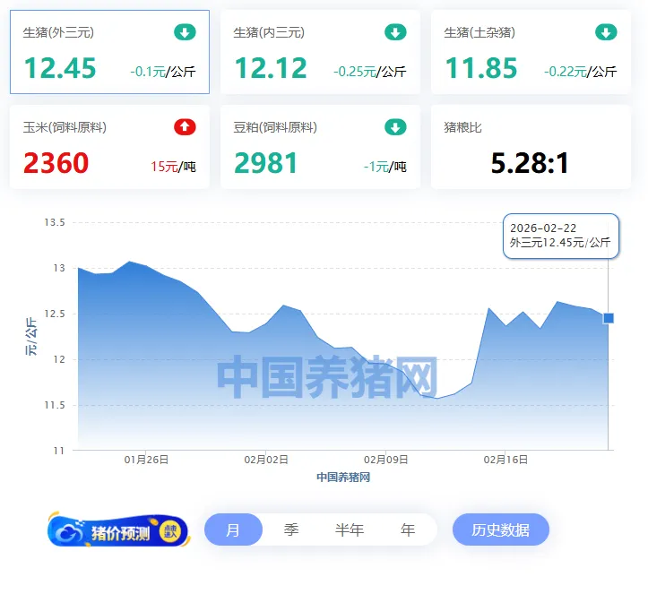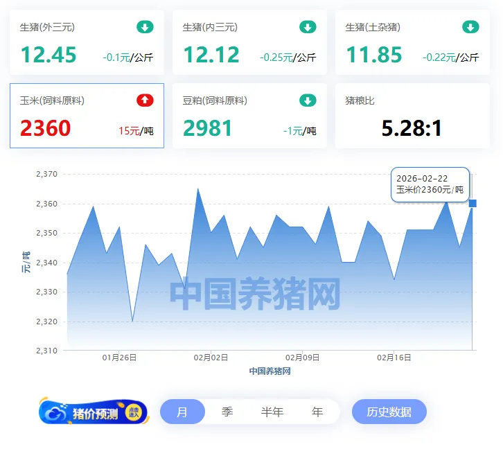 2026年02月22日-中国养猪网 全国玉米价格走势图及涨跌表