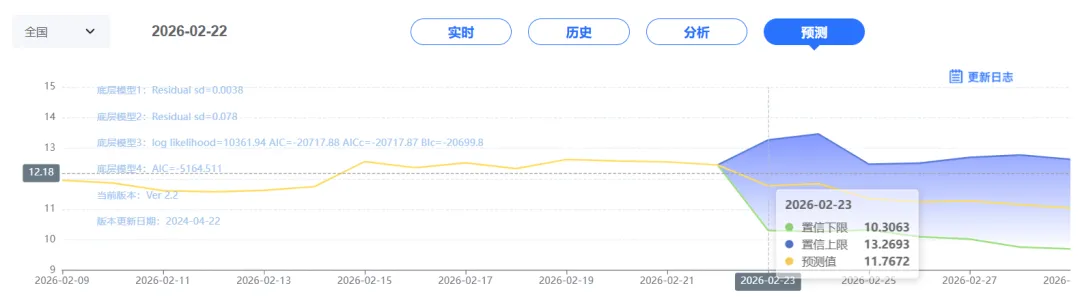 玄田算法是由项目课题组团队原创的非经典逻辑数值聚合理论和不确定性预测方法,构建了基于一致模算子的生猪价格预测模型。该模型采用的聚合函数及一致模相关理论与方法已获得多项国家自然科学基金和省级自然科学资金资助,并获得多项省级自然科学奖奖项。02月23日预测猪价为11.7672,置信区间在10.3063--13.2693之间。02月24日预测猪价为11.8384;02月25日预测猪价为11.3492。