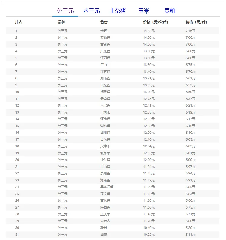 全国外三元生猪价格排行榜
