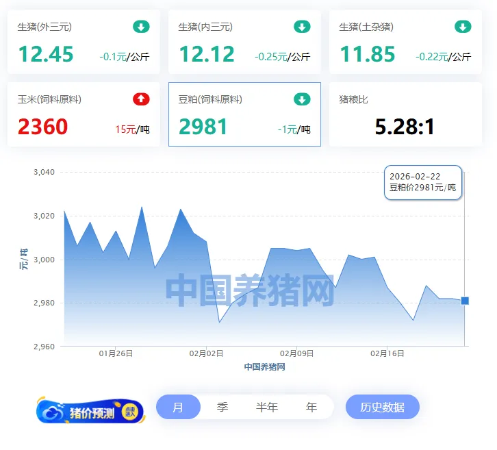 2026年02月22日-中国养猪网 全国豆粕价格走势图及涨跌表