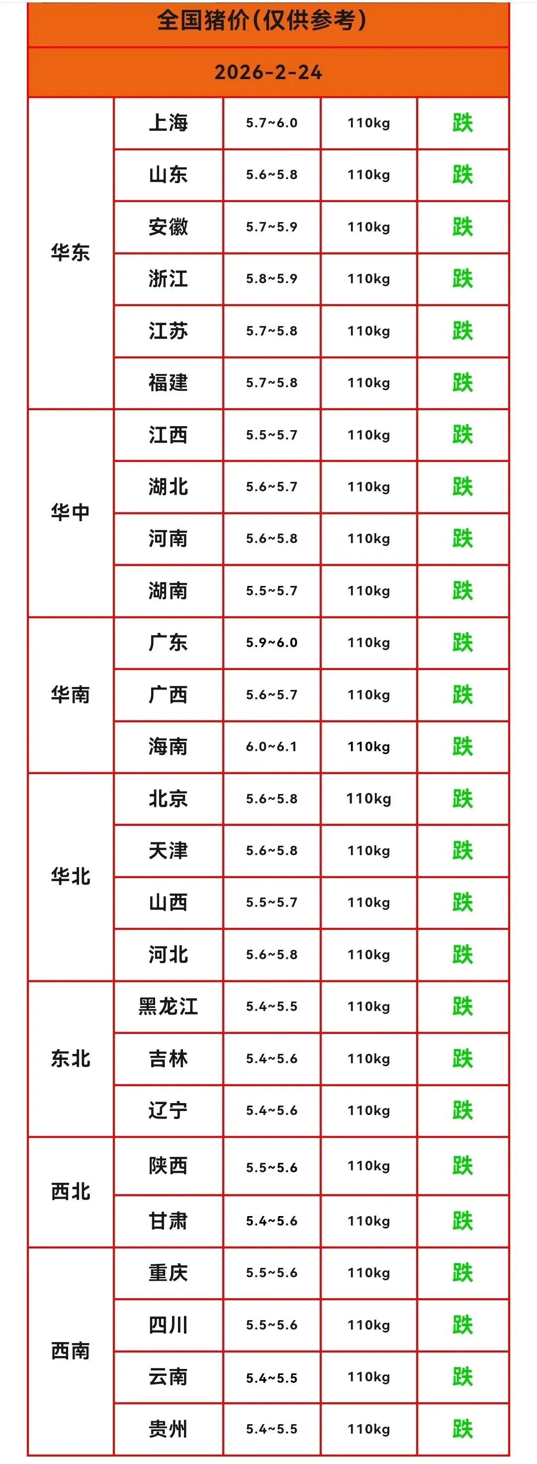 【明日猪价】2026.2.24 猪价大跌,春节假期后第一天,猪价全面下跌! 养羊网 2026-02-23 【明日猪价】2026.2.24 猪价大跌,春节假期后第一天,猪价全面下跌! 养羊网 2026-02-23 上一篇:【猪价大预测】2026年2月2月25日~2月28日!!全国猪价! 下一篇:深度预警:节后猪价全线失守,产能与需求双重挤压,养猪人该如何突围? 您可能还会对下面的文章感兴趣111: 相关文章 ÷牧羊女,价格随便定 ?黑五0薅雨森鸡蛋教程 美国富豪vs关税后的富豪 《牛羊生产》试讲逐字稿47篇