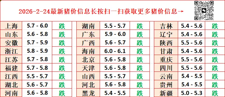 2026.2.24-明日猪价( 最新猪价已更新!) 养羊网 2026-02-23 2026.2.24-明日猪价( 最新猪价已更新!) 养羊网 2026-02-23 上一篇:【明天猪价】2月24日 全国猪价! 下一篇:2026年2月23日全国鸡蛋价格汇总(参考) 您可能还会对下面的文章感兴趣111: 相关文章 【明天猪价】2026. 02.20 一夜升温!多地上涨!养猪户卖猪意愿低! 2025年4月13日全国各地生猪价格信息 猪价以涨为主!猪价今日猪价行情价格表 | 2026.1.20最新今日猪价格表行情走势分析 今夜交大夜市!gogogo,出发咯~