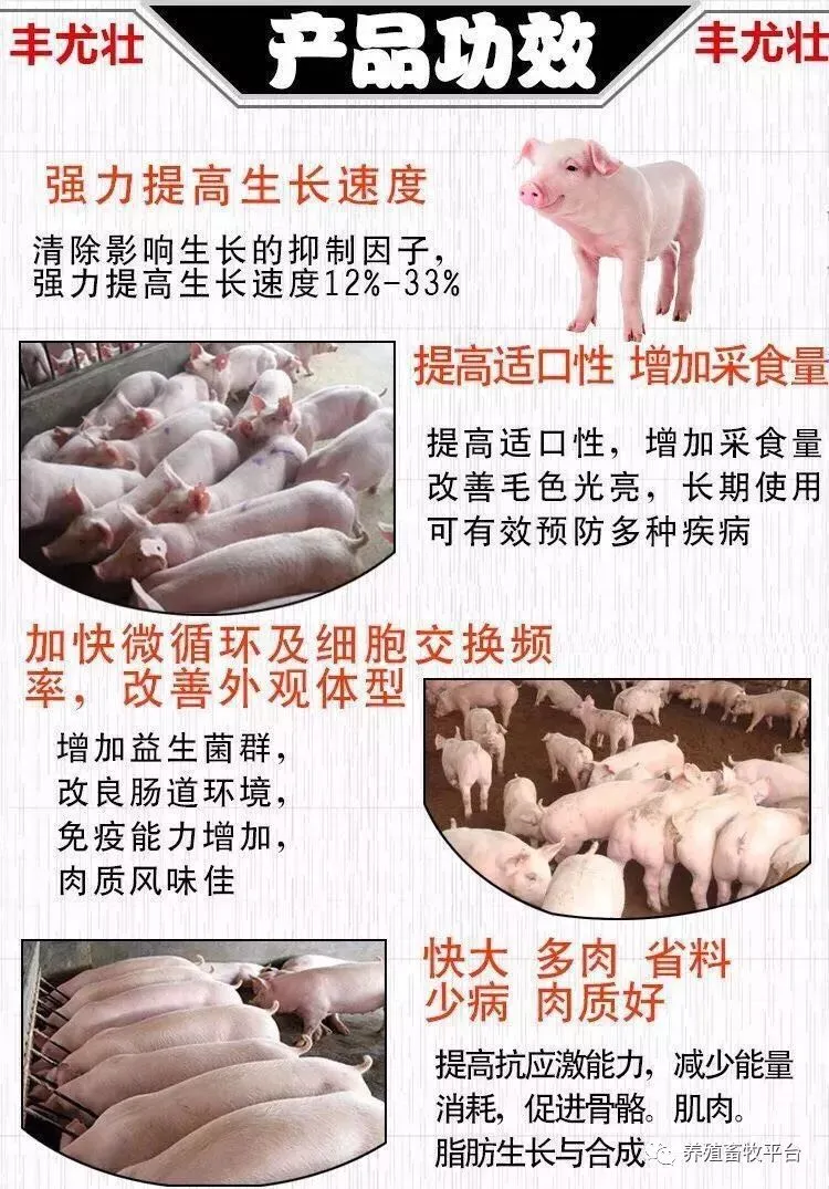 丰尤壮中添加的有IGF-1,IGF-2,促使吸收优质的活性钙,促进骨骼的生长,显著提高畜禽的生长速度。 丰尤壮有改善体型的作用,提高屠宰率和瘦肉率,降低猪的背标脂肪厚度,使猪群臀腿肌 发达饱满,体型丰满结实,外观好看,增加卖价。