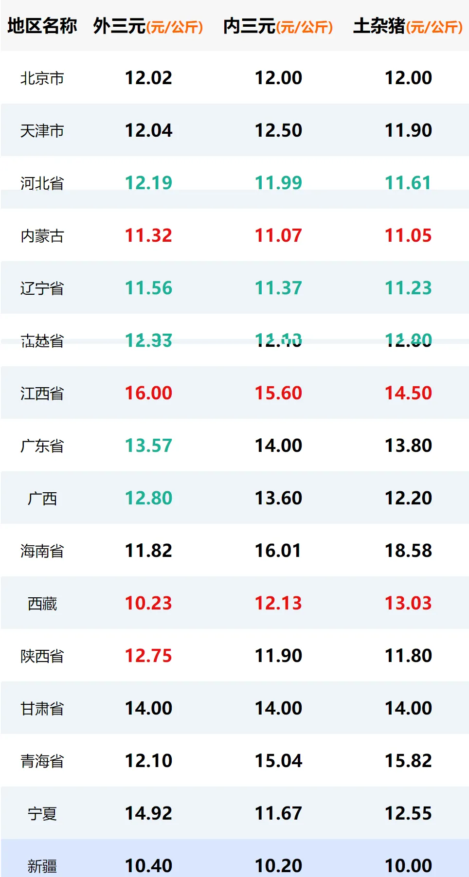 ?涨幅突出区域? 浙江省:较昨日上涨2.35元,较上周上涨2.55元,是华东地区涨幅最大的省份,猪价从12.00元涨至14.35元,涨幅显著。 陕西省:较昨日上涨1.25元,较上周上涨1.25元,西北地区猪价上涨明显,从11.50元涨至12.75元。 江西省:较昨日上涨2.40元,较上周上涨4.35元,华东地区涨幅居前,猪价从13.60元涨至16.00元。 ?跌幅明显区域? 广西壮族自治区:较昨日下跌0.70元,是当日跌幅最大的省份,猪价从13.50元跌至12.80元。 江苏省:较昨日下跌0.47元,较上周下跌0.67元,华东地区猪价下跌较多,从13.40元跌至12.93元。 内蒙古自治区:较上周下跌0.68元,华北地区猪价环比上周有所回落,从11.20元跌至11.32元。