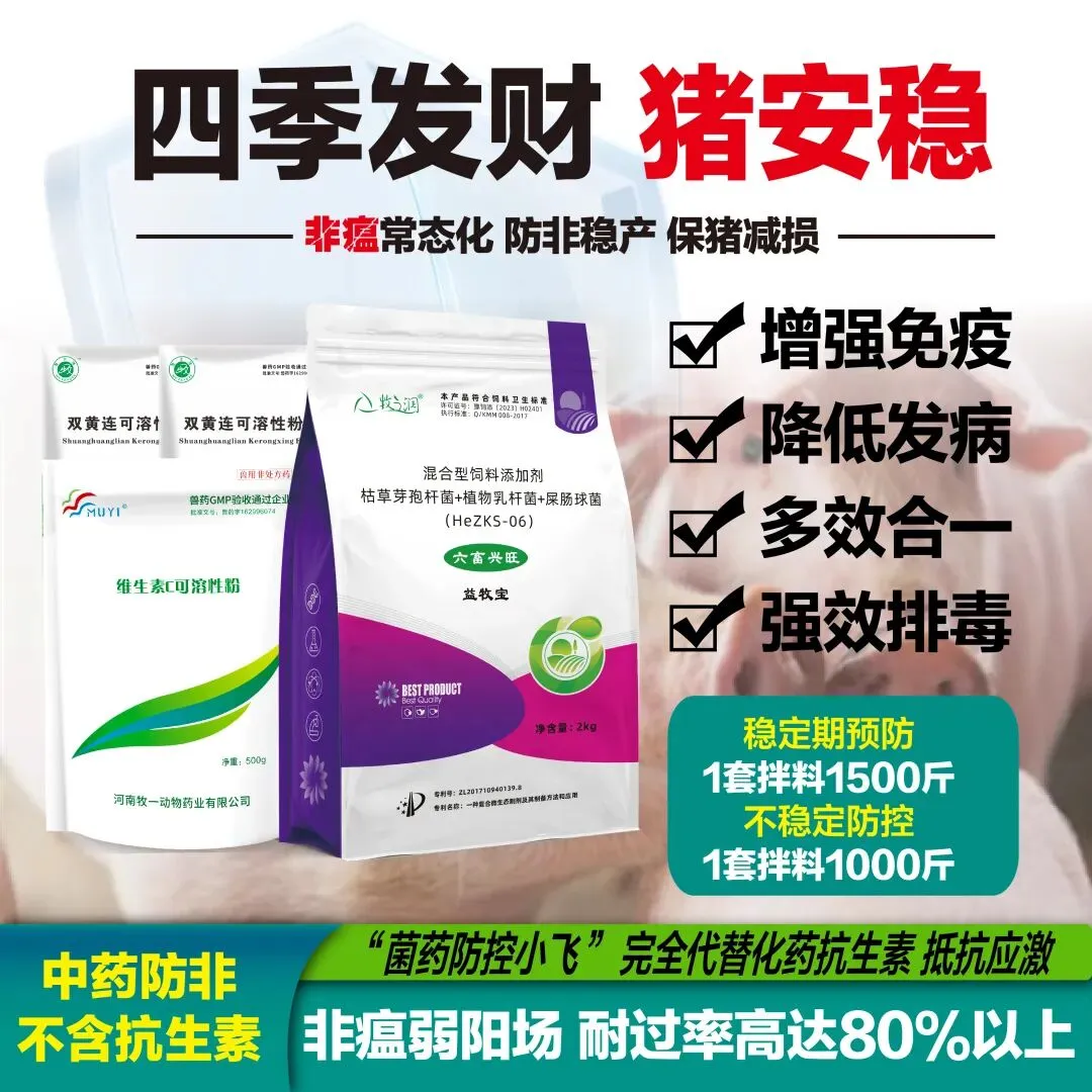 如果咱们周边现在小飞比较严重,一定要认真看一下!!! ?如果咱们周边现在小飞比较严重,一定要认真看一下!!! 已经在多个规模性猪场经过试验! 绝对是一套经得起实践防控非洲猪瘟套餐产品! 不含抗生素,“菌药”防非稳产能,保猪减损! 组方成分不含西药成分,大大增加猪群抗非能力,抵抗小飞耐过率高达80%以上!使用3-7天猪群采食、活力增加,7-15天整体抗病力增强,免疫力提高,通过猪群强大的自身抗病力和免疫力保护猪群抵抗小飞病毒的侵害。大大提高防非的效果。 非瘟防控套餐——1袋 益牧宝+1袋 维生素C+2袋 双黄连可溶性粉 三大特效: ①快速抗败血酸强效排毒增强大群抵抗体 这一套防非组合方案针对非瘟弱阳场能够有效控制非瘟的传播,降低猪致死率,提高猪群抗病毒能力,强效排毒增强免疫,让猪群安全耐过,弱阳猪场定期添加耐过率高达80%以上。不含化药成分,完全代化药类替抗生素。
