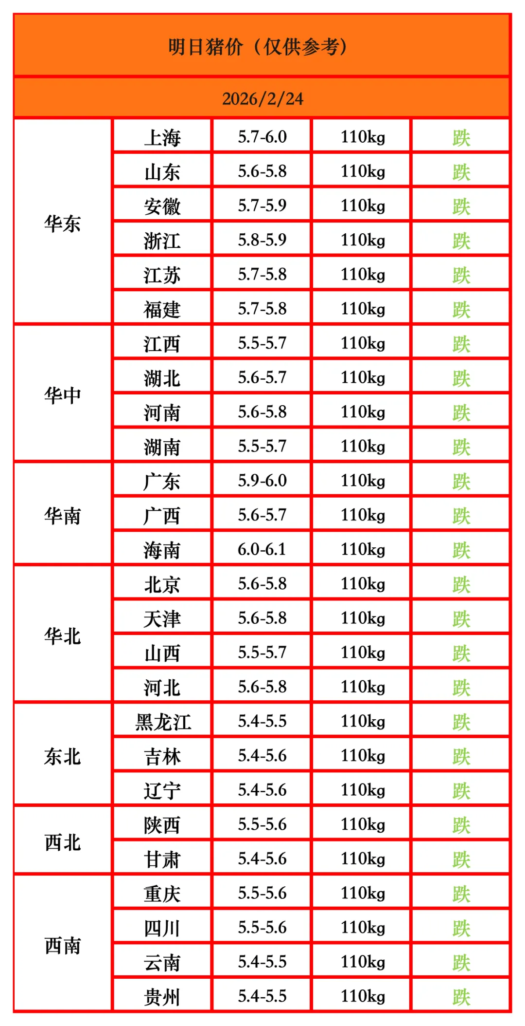 猪价点评 1、整体来看,全国生猪价格呈现震荡偏弱的态势,无省份价格上涨;而上海、山东、安徽、浙江、江苏、福建、江西、湖北、河南、湖南、广东、广西、海南、北京、天津、山西、河北、黑龙江、吉林、辽宁、陕西、甘肃、重庆、四川、云南、贵州等省份价格下跌,跌幅在0.02-0.30元/公斤。