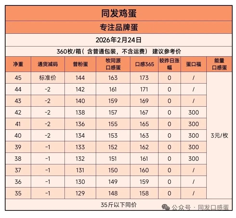 2026年2月24日贵港同发鸡蛋价格 养羊网 2026-02-24 2026年2月24日贵港同发鸡蛋价格以上价格为贵港同发鸡蛋平台公示的鸡蛋含包装成交结算价(上车价),仅供本平台渠道对接合作伙伴参考使用,不与其他任何报价做比较。 养羊网 2026-02-24 上一篇:2.24全国鸡蛋价格 下一篇:大洋路鸡蛋价格2026年 2 月 24 日报价 您可能还会对下面的文章感兴趣111: 相关文章 2025年4月13日全国各地生猪价格信息 我的草场地画室 - 2025年5月的照片 箜 我滴乖乖!羊肉就我卖的Z便宜?你们那多少