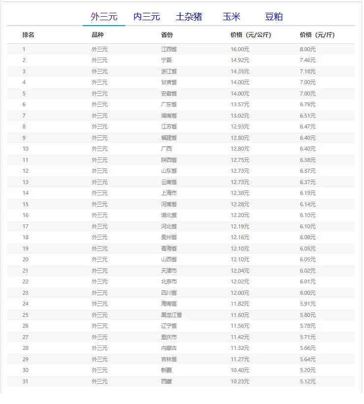 全国外三元生猪价格走势图及涨跌表