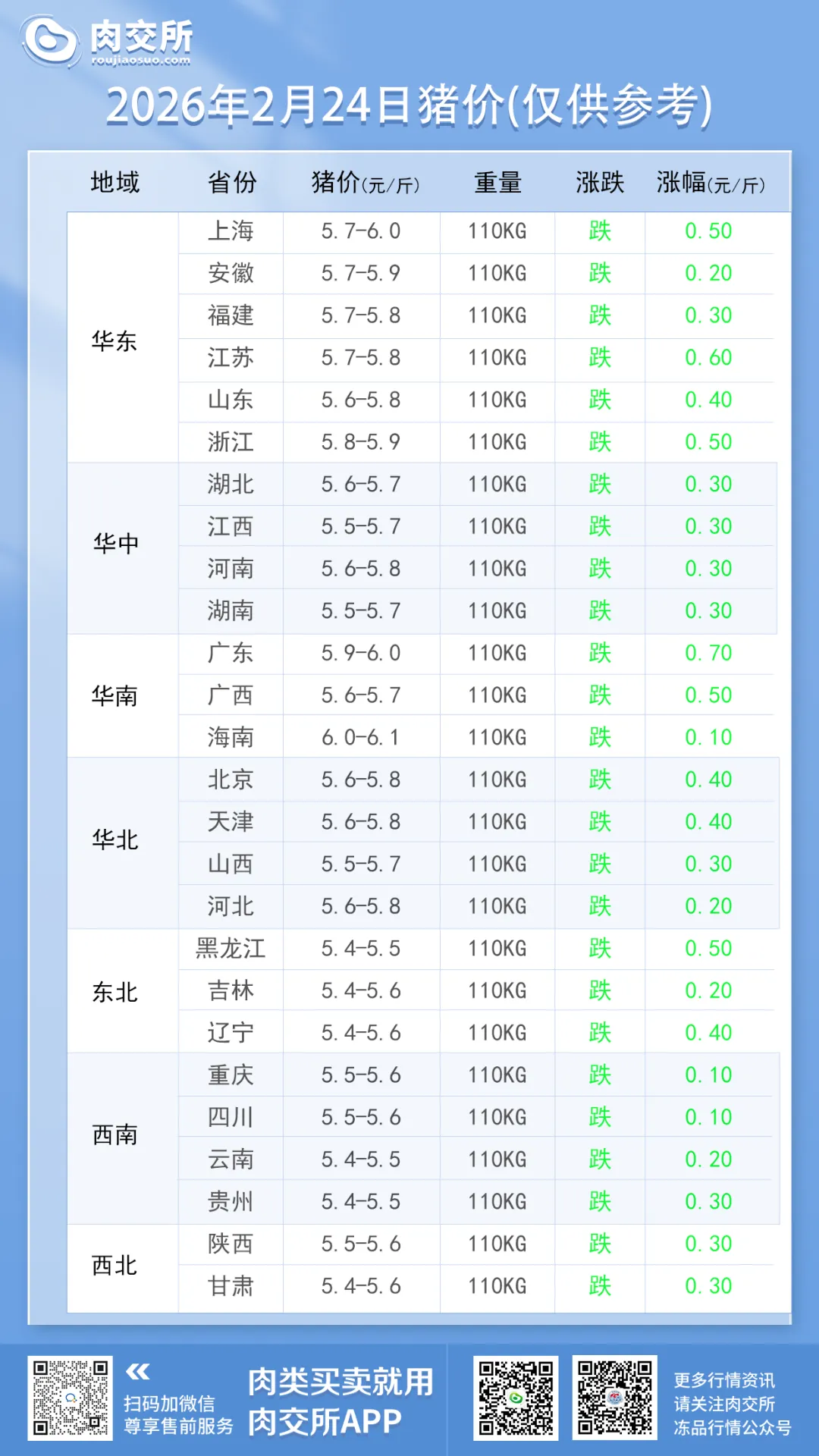福建、湖北、江西、河南、湖南、山西、陕西、甘肃、贵州跌 0.3 元 / 斤,安徽、河北、云南跌 0.2 元 / 斤,吉林、重庆、四川跌 0.1 元 / 斤; - 价格探底