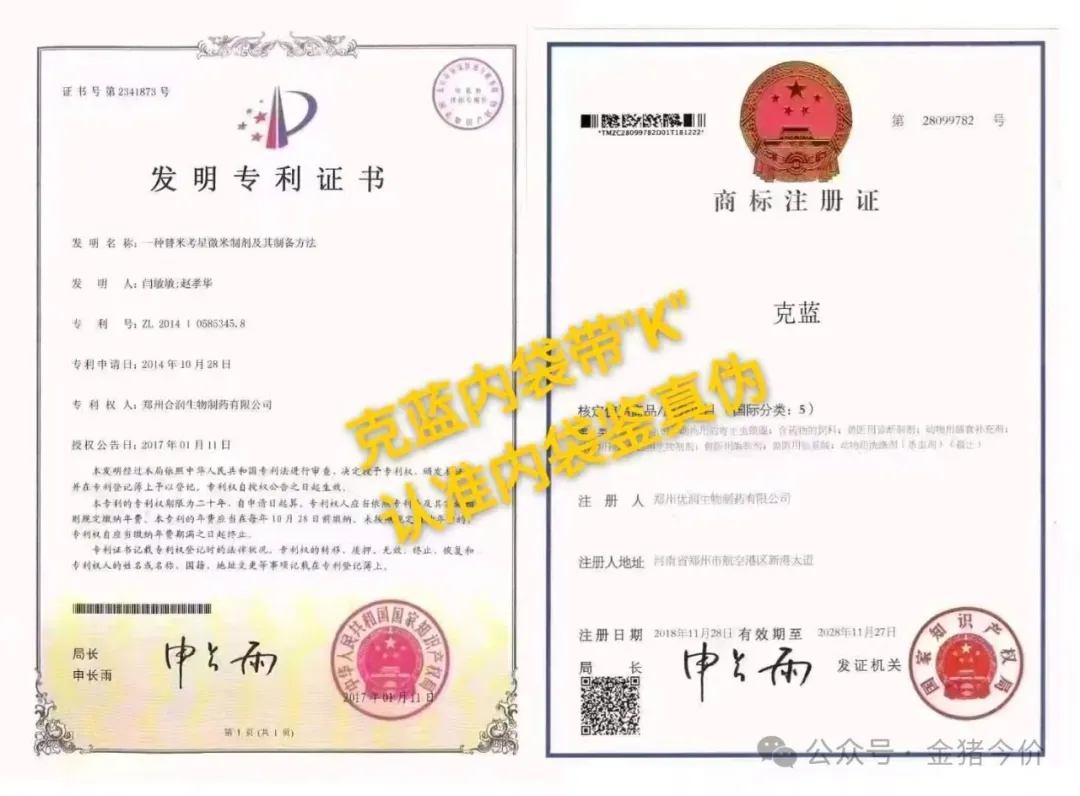 (1)研究历程:克蓝是畅销产品从08年开始就已经使用,历经十多年年逐步完善,2016年初上报农业部门经过一年的论证研究证实,证明克蓝套餐,针对蓝耳,圆环,副猪,支原体,链球菌,具有很好的净化治疗效果,最后颁发克蓝套餐专利证书让更多养殖朋友信任产品,并且名字申请了商标证书,是具有唯一性,专属优润集团专用。下图是产品专利证书,商标注册证书