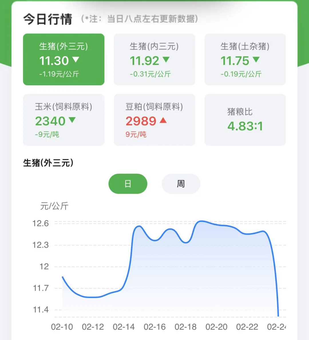 猪价回落祝朋友们春节快乐,开工大吉。今天开始正常更新了。 1、今日猪价回调。 河南猪价在2月15日涨了0.82元/kg,那是春节放假的第一天。在2月24日春节上班第一天跌了1.19元/kg,来到11.3元/kg。整体看,生猪供给仍然是多的,节后家庭和餐饮消费减弱,猪价难有支撑。