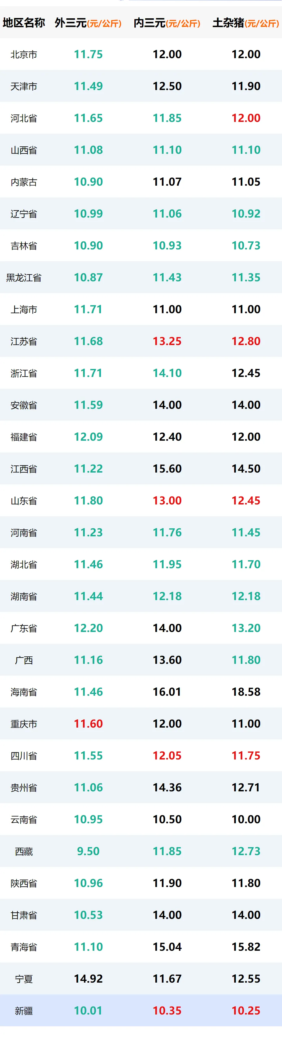 区域方面,东北10.85-10.95元/公斤,华北、西北10.5-11.6元/公斤;西南川渝11.5-11.6元/公斤、云贵11.0-11.05元/公斤;华东11.6-11.7元/公斤;华中河南11.2元/公斤、两湖11.4元/公斤;华南两广11.1-12.1元/公斤。