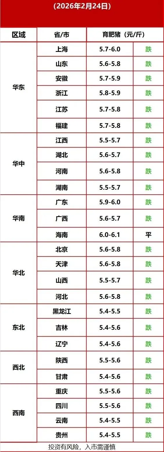 2月24日猪价全国下跌 养羊网 2026-02-24 2月24日猪价全国下跌每日猪价行情2月24日猪价全国下跌www.chinabreed.com中国养殖网 养羊网 2026-02-24 上一篇:2.25明日猪价早知道!继续下跌! 下一篇:猪价大预测】2月26日~2月28日全国猪价大预测! 您可能还会对下面的文章感兴趣111: 相关文章 2025年4月13日全国各地生猪价格信息 鹿儿岛 寿庵 鸡蛋价格一览|2026年1月24日鸡蛋价格(明日早知道) 猪周期 处于什么位置了?