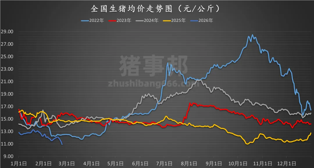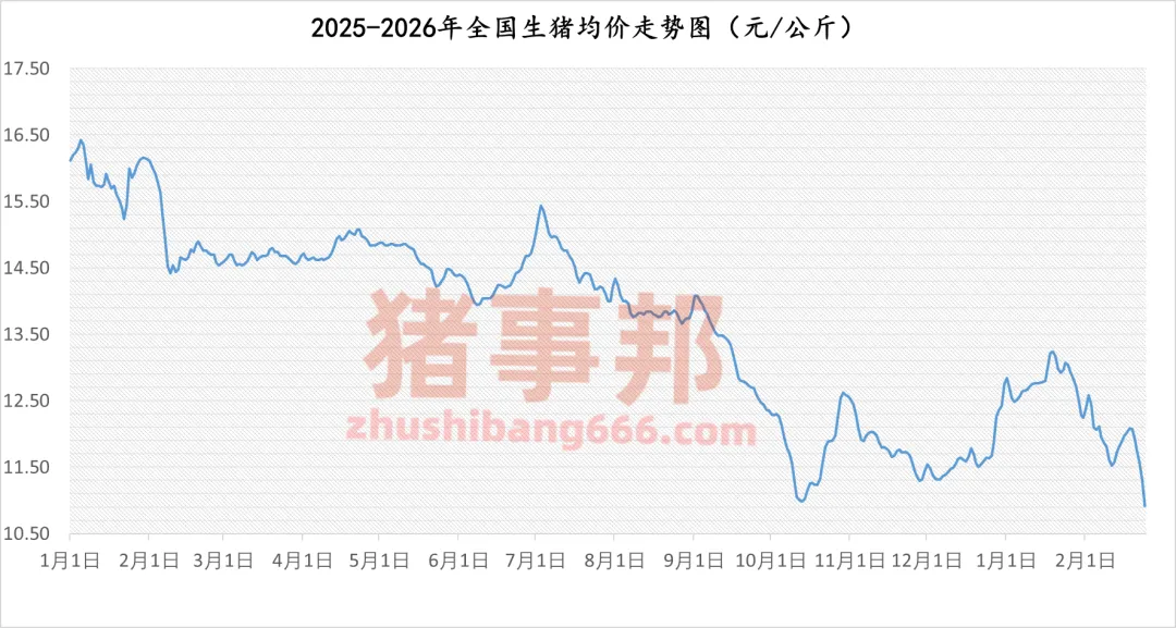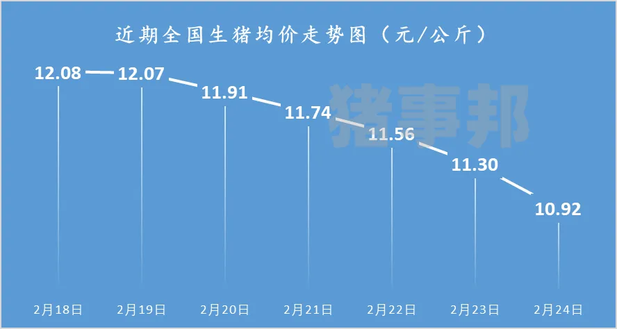 据猪事邦平台汇总的数据,2月24日全国生猪均价为10.92元/公斤,较昨日下跌3.48%,同比下跌25.82%(去年同期全国生猪均价14.72元/公斤)。