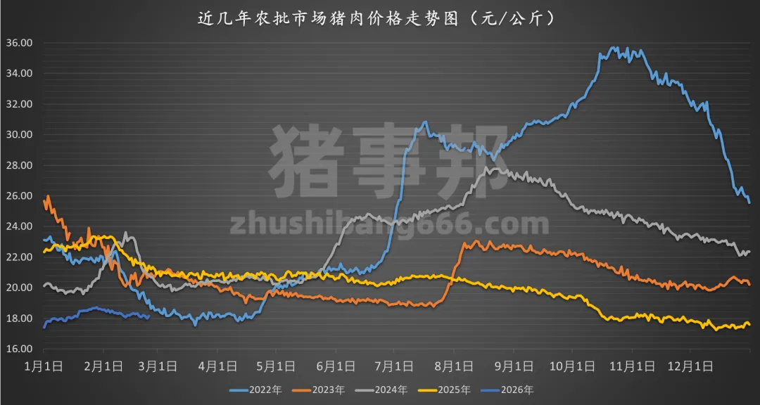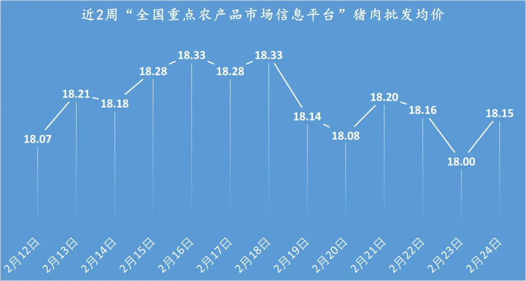 据农业农村部“全国重点农产品市场信息平台”监测数据,2月24日全国农产品批发市场猪肉平均价格为18.15元/公斤,较昨日上涨0.8%,同比下跌15.3%(去年同期猪肉批发价格21.42元/公斤)。