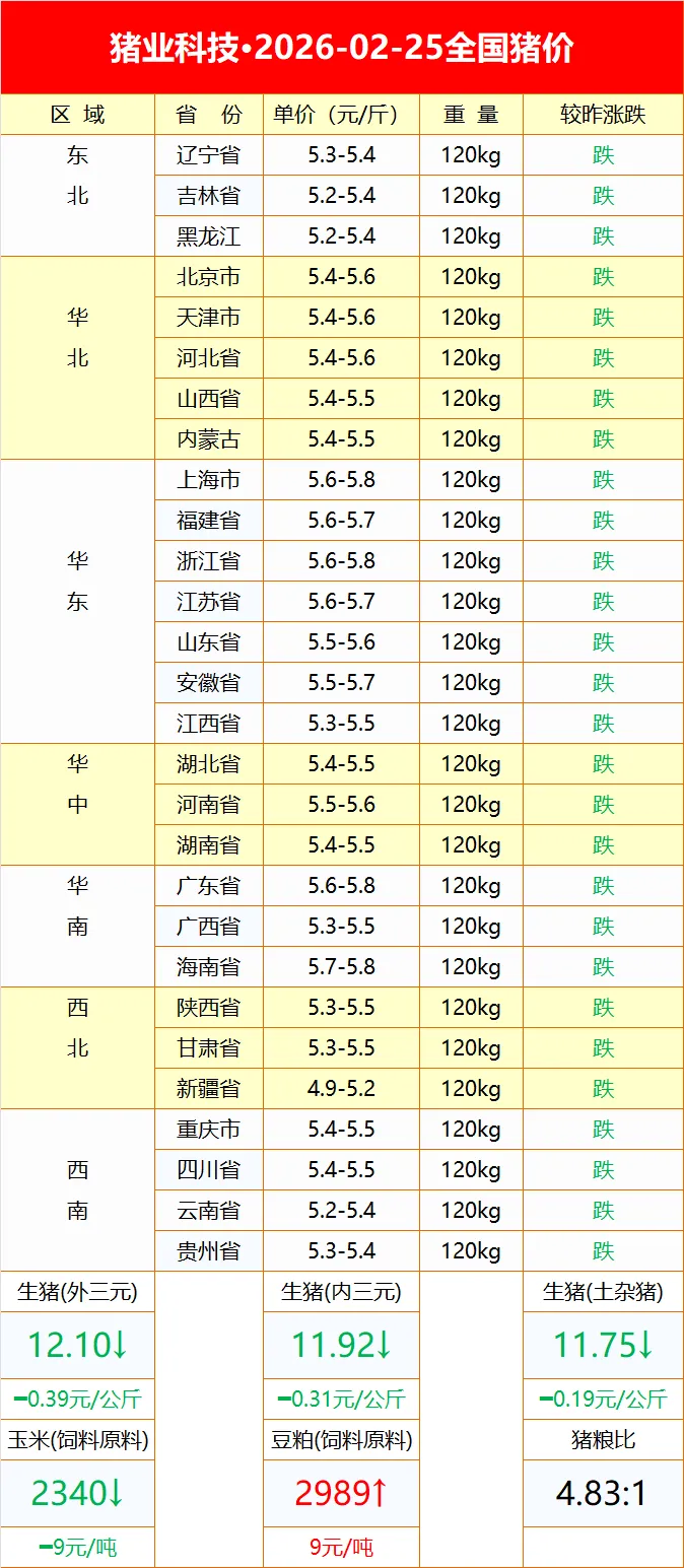 2026-02-25明日猪价 养羊网 2026-02-24 2026-02-25明日猪价? ?别忘了点个在看哦? 养羊网 2026-02-24 上一篇:2月25日全国生猪价格——猪价再跌! 下一篇:【拉猪啦】2.25-猪价行情与买卖猪信息!(需求减弱,大幅下跌!) 您可能还会对下面的文章感兴趣111: 相关文章 2025年4月13日全国各地生猪价格信息 2026年猪价怎么走?专家给养猪人的4句大实话,越早看越少走弯路! 2025年4月13日全国各地生猪价格信息 2026.02.17-明天猪价(新年快乐,万事顺意!)