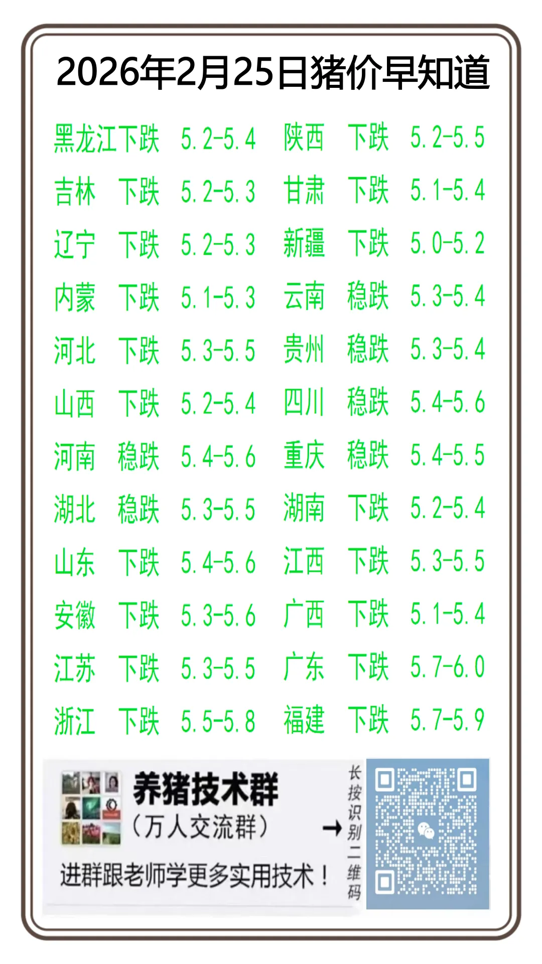 猪价创新低!2026年2月25日全国猪价继续下跌!! 养羊网 2026-02-24 猪价创新低!2026年2月25日全国猪价继续下跌!! 养羊网 2026-02-24 上一篇:2026-2- 25全国猪价预测 下一篇:猪价下跌面扩大平均价格跌破5.5元 您可能还会对下面的文章感兴趣111: 相关文章 2025年4月13日全国各地生猪价格信息 海外猪瘟+关税加码,国内养猪“暴击二连” 全国中药材市场价格监测20250116 2025年4月13日全国各地生猪价格信息