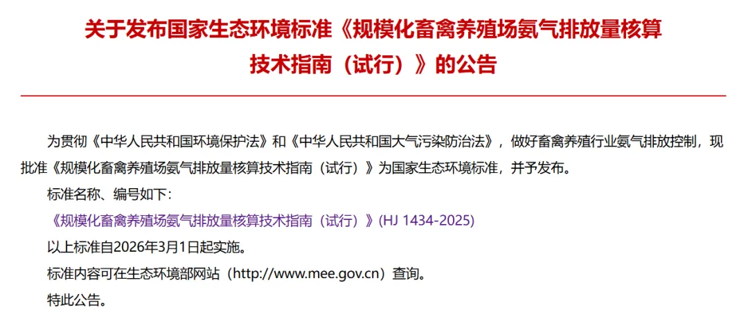 2026 年 3 月 1 日起,由生态环境部发布的国家生态环境标准《规模化畜禽养殖场氨气排放量核算技术指南(试行)》将在全国范围内正式实施。