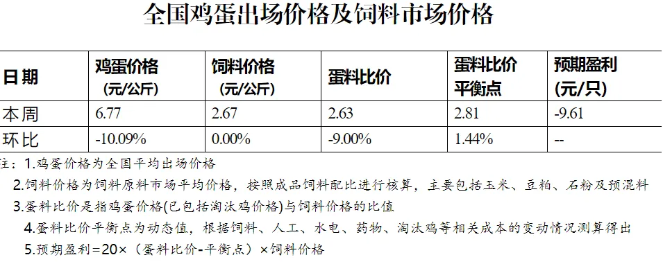 本周全国蛋料比价为2.63,环比下跌9.00%。按目前价格及成本推算,未来蛋鸡养殖每只亏损9.61元。春节临近,需求持续减弱,且鸡蛋货源供应充足,周内蛋价继续下跌。