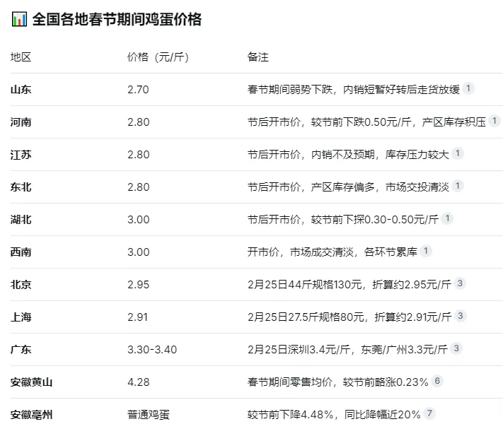 春节期间全国蛋价下滑明显,在内销春节带动下走货好转,但蛋价一直没有上涨,各地区走货速度放缓,各环节库存有所积压,蛋价随之下跌,最高下降近20%。