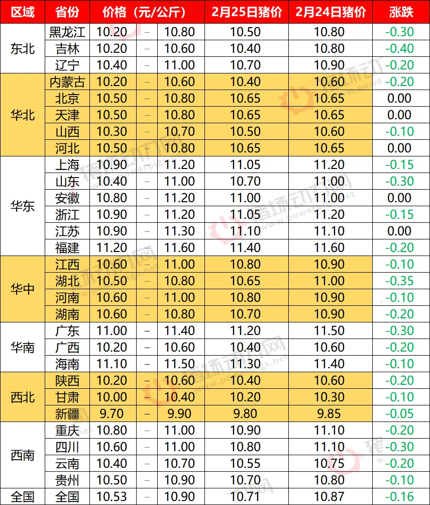 2月25日全国猪价大幅下跌【动力猪价】