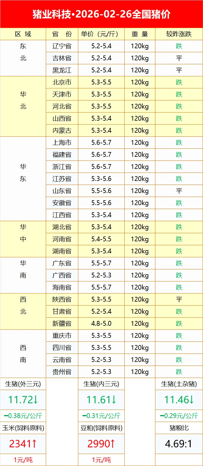 2026-02-26明日猪价 养羊网 2026-02-25 2026-02-26明日猪价? ?别忘了点个在看哦? 养羊网 2026-02-25 上一篇:短期内,猪价重心或将继续下移! 下一篇:2026.2.26明日全国猪价 您可能还会对下面的文章感兴趣111: 相关文章 近期价格更新!!! 2025年4月13日全国各地生猪价格信息 2025年4月13日全国各地生猪价格信息 2025年4月13日全国各地生猪价格信息
