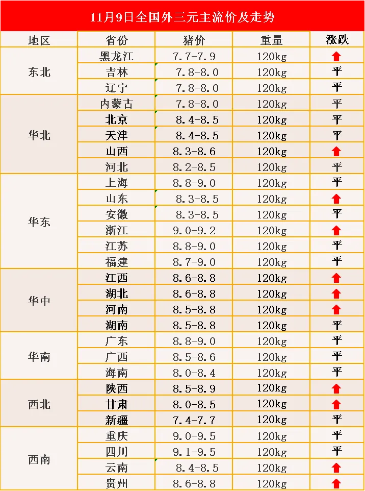 3、整体来看,全国生猪价格呈现大部下跌态势。今日集团猪场生猪成交价格呈现大部下跌,东北、华北、华中、华东、西南、华南地区集团猪场猪价呈现稳中伴跌态势,西北地区集团猪场猪价呈现跌涨调整态势。华东、华中地区龙头集团110-125公斤生猪价格跌涨0.05元/公斤,125-140公斤生猪价格稳中伴跌0.05-0.25元/公斤,龙头集团猪价呈现大部下跌,江苏地区部分体重段生猪价格小幅上涨。从养殖集团生猪上市量来看,华中、西北集团生猪上市量有所减少,华东、西南集团生猪上市量有所增加。(来源网络)