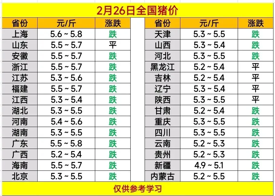 2026.2.26——明日猪价预测 养羊网 2026-02-25 2026.2.26——明日猪价预测 养羊网 2026-02-25 上一篇:明日猪价(2026年02月26日) 下一篇:2026.2.26明日猪价行情 您可能还会对下面的文章感兴趣111: 相关文章 2025年4月13日全国各地生猪价格信息 0.7毛一个土鸡蛋,还是觉得贵了! 2025年4月13日全国各地生猪价格信息 近期价格更新!!!