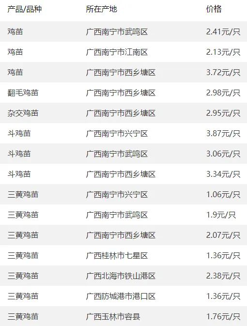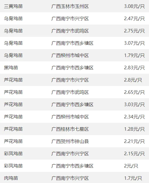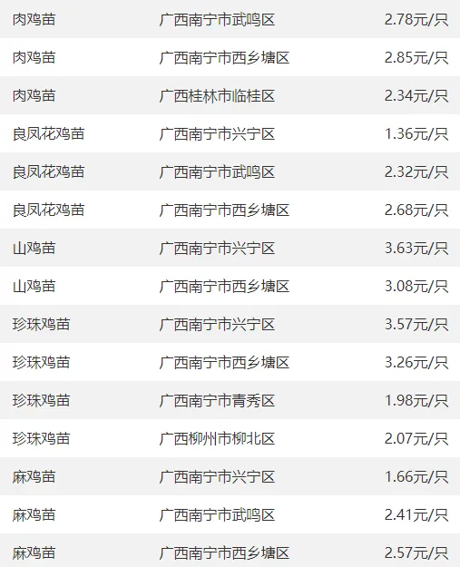 广西部分地区鸡苗价格