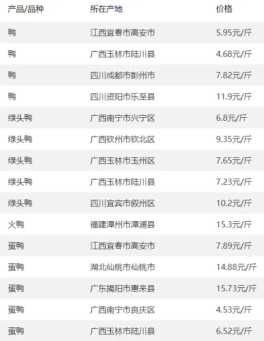 全国部分地区鸭的价格参考?