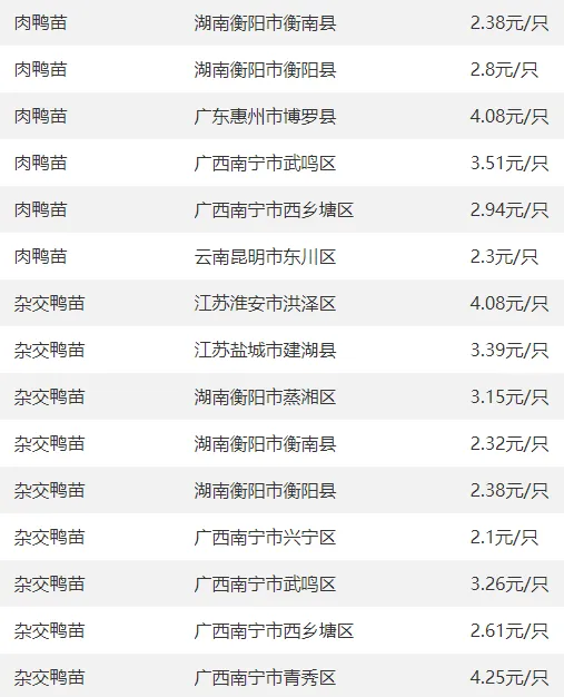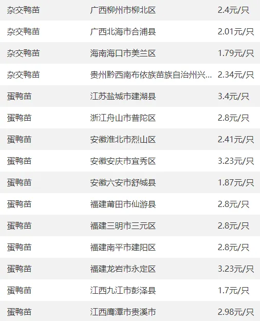 全国部分地区鸭苗价格参考