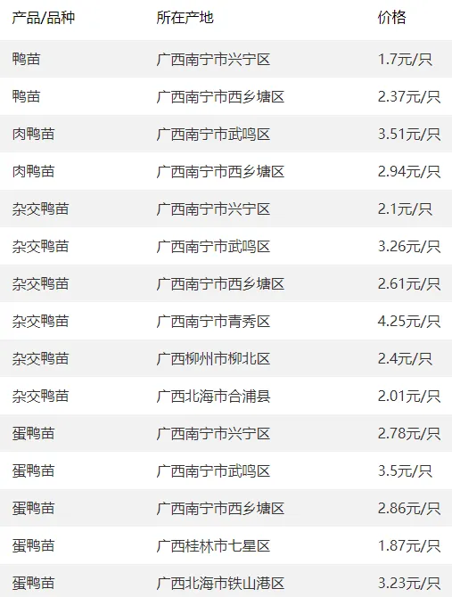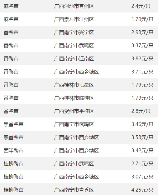 广西部分地区鸭苗价格参考