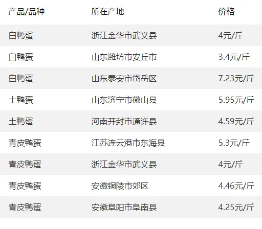 全国部分地区鸭蛋价格参考