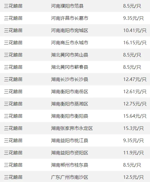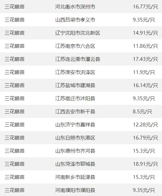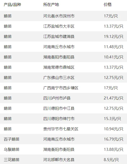 全国部分地区鹅苗价格参考