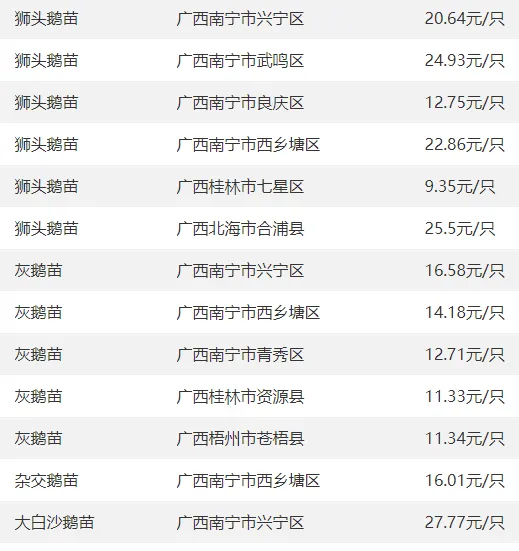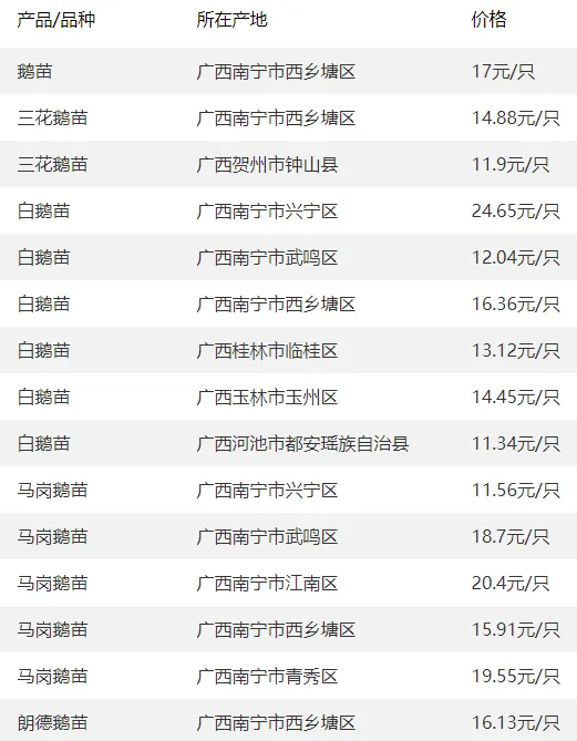 广西部分地区鹅苗价格参考