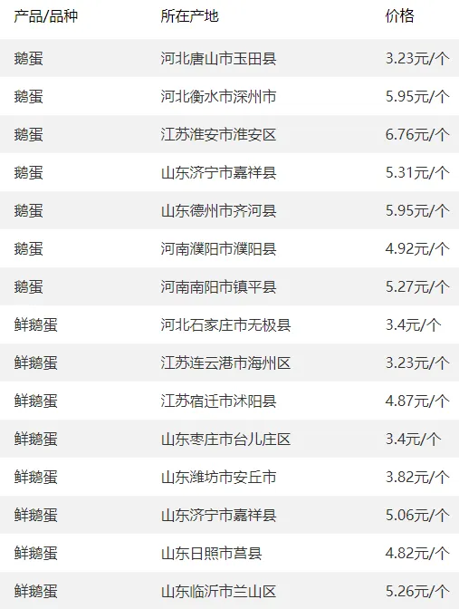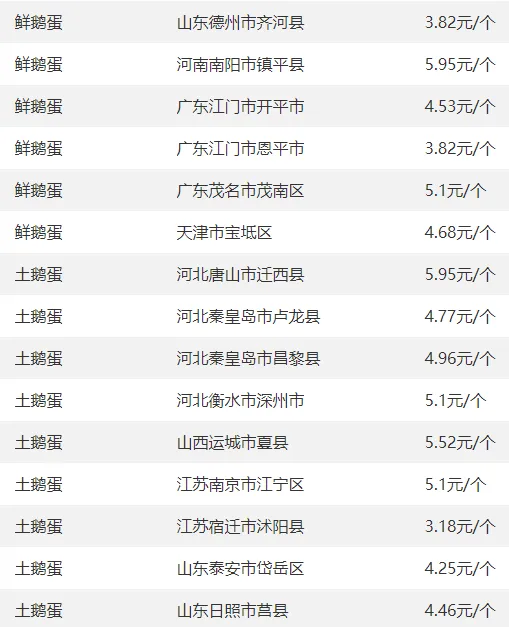 全国部分地区鹅蛋价格参考