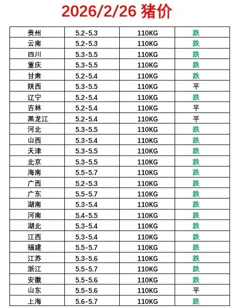 2026.2.26猪价出来了 养羊网 2026-02-25 2026.2.26猪价出来了 养羊网 2026-02-25 上一篇:今日猪价| 2026.2.26.全国最新猪价信息(只供参考) 下一篇:【超前猪价】2月27-3月2日 猪价!全国猪价大预测 您可能还会对下面的文章感兴趣111: 相关文章 商战别只会买奶茶了! IBox-数藏现状:存量博弈,零和游戏 鸡蛋期货8.21 明日猪价—2026年01月26日(全国最新生猪价格)