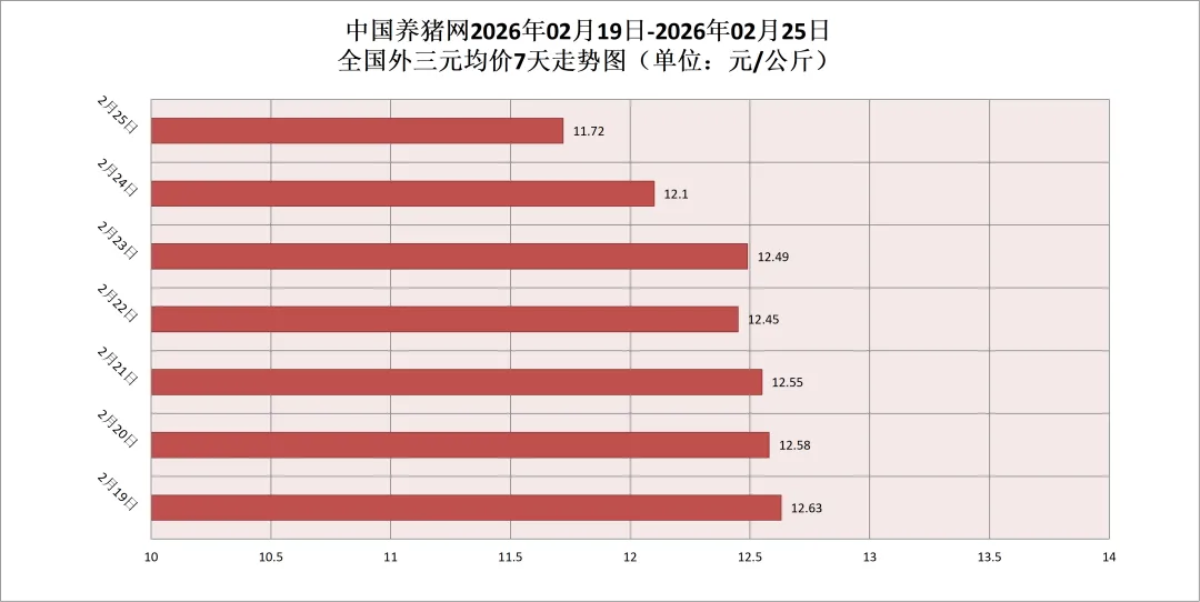 2026年02月25日(星期三),据中国养猪网猪价系统监测,全国外三元均价为11.72元/公斤,猪价较昨日(12.1元/公斤)下跌0.38元/公斤,较上月(13.07元/公斤)下跌了1.35元/公斤。