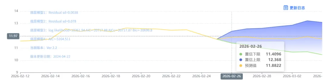 玄田算法是由项目课题组团队原创的非经典逻辑数值聚合理论和不确定性预测方法,构建了基于一致模算子的生猪价格预测模型。该模型采用的聚合函数及一致模相关理论与方法已获得多项国家自然科学基金和省级自然科学资金资助,并获得多项省级自然科学奖奖项。2月26日预测猪价为11.8822,置信区间在11.4096--12.368之间。02月27日预测猪价为11.9049;02月28日预测猪价为11.7835。