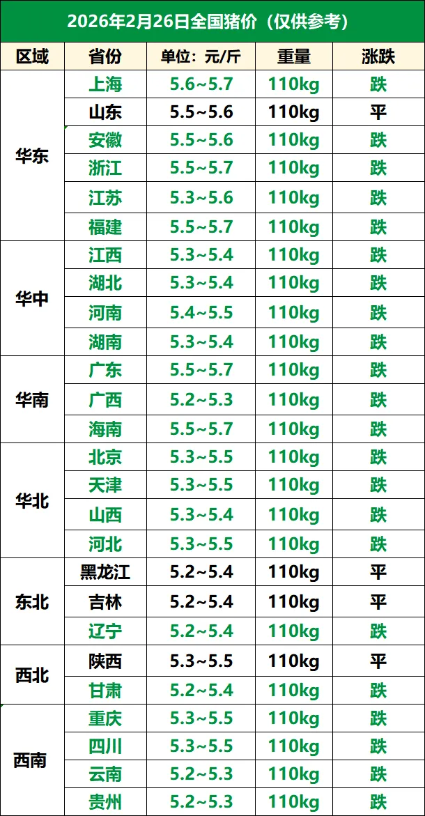 2月26日全国猪价跌猛了,下跌“势如破竹”! 养羊网 2026-02-26 2月26日全国猪价跌猛了,下跌“势如破竹”! 养羊网 2026-02-26 上一篇:2月26日最新猪价!持续猛跌!! 下一篇:【明日猪价】2026.02.27:持续下跌!!! 您可能还会对下面的文章感兴趣111: 相关文章 内蒙羊,很难吃上吗? 8块钱买了30个鸡蛋 1月27日重庆鸡蛋价格参考; 2025年4月13日全国各地生猪价格信息