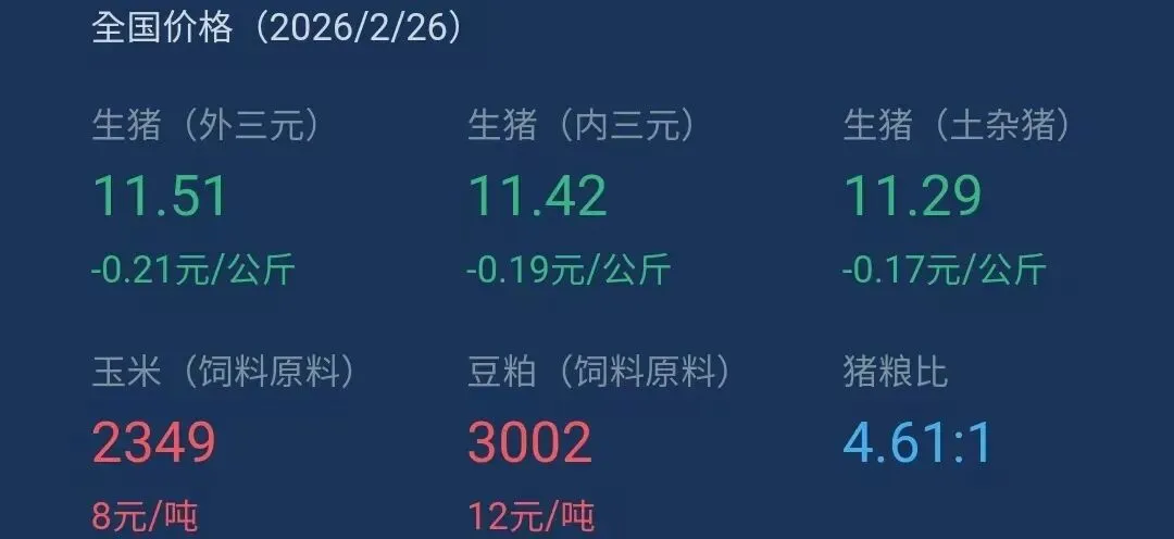 一、今天(2026年2月25日)全国生猪标准体重平均价格10.8-11.7元/公斤,同比昨日(2026年2月24日)价格上涨0.05元/公斤。