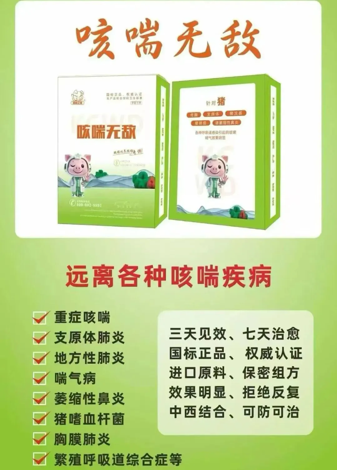 咳喘无敌 一套6种药,专治呼吸道的止咳平喘大组方,见效快 不反复食神 ~专治猪不吃 母猪产后不吃 高烧不吃 低温不吃 便秘不吃 一针见效 无效包退 联系??:153 3382 5513