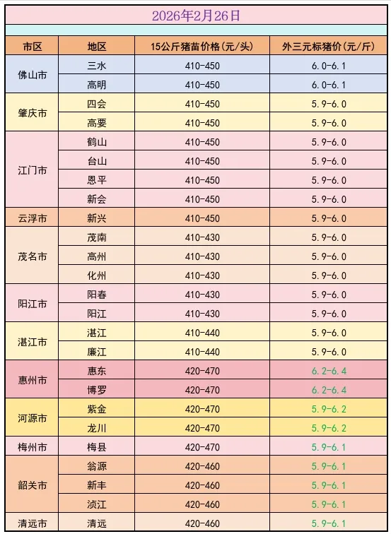 2月26日猪价速递 养羊网 2026-02-26 2月26日猪价速递广东猪苗全省各报410~470元,毛猪报5.9~6.4元,除惠州、河源、梅州、韶关和清远微跌0.1元,连续四连跌外,其它各地都稳定。(行情仅供参考) 养羊网 2026-02-26 上一篇:2026.2.27日猪价 下一篇:每日猪价| 2026.2.27 陕西涨 您可能还会对下面的文章感兴趣111: 相关文章 2026.2.23猪价出来了 第39篇:什么是【猪周期】? 2026年1月28日鸡蛋价格信息 【明日猪价】2026.2.11全国猪价维稳,局部保持小幅波动,适时出栏
