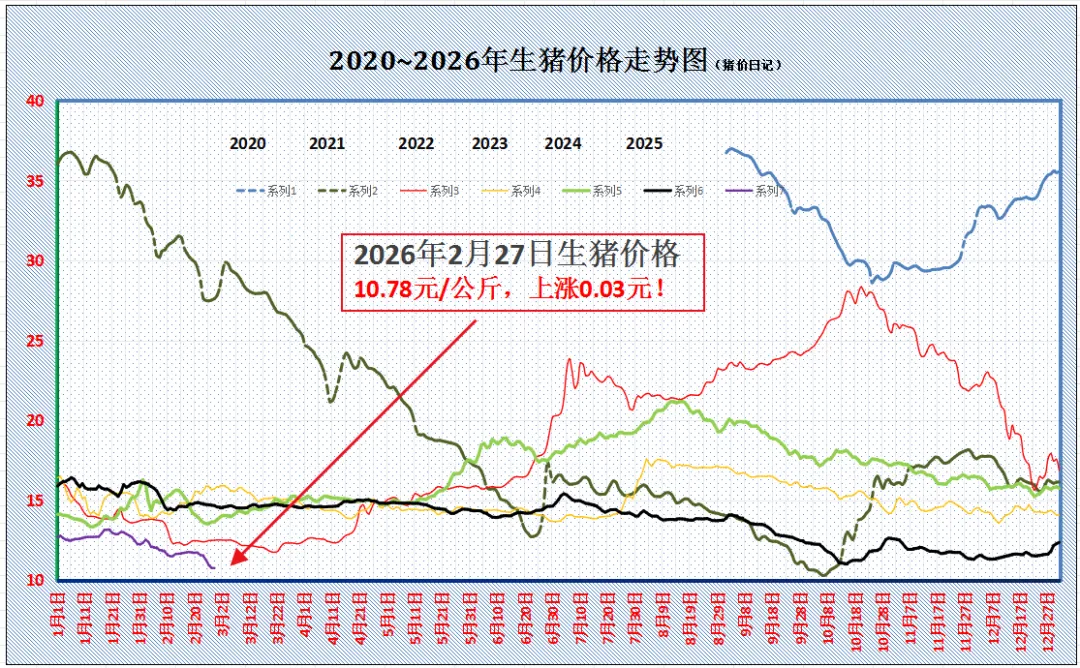 好消息,猪价下跌“熄火”!新一轮“猛烈”上涨?附:2月27日猪价时光荏苒,2月即将收官,春节后,国内生猪市场进入季节性淡季,市场呈现“断崖”下跌的走势,尤其是,消费转入淡季,下游需求支撑不足,而养殖端出栏恢复,集团猪企节后增量出栏,供需失衡下,猪价加速下跌,国内标猪均价跌至10.75元/公斤,猪价创下近5年以来新低,相比去年同期下降超26%。不过,从最新消息了解,节后,猪价大幅走低后,市场情绪略有改善,猪价底部支撑略有转强,分析如下: 从生猪购销来看,昨日,国内生猪近月2605以及2607等合 约报价略有走强,数据显示,其中,2603报价在11465元/吨,2605报价在12345元/吨,2609报价在13310元/吨,2611报价在13265元/吨,主流报价上涨175~245元/吨! 从市场反馈了解,由于2025年母猪存栏去化启动,尤其是,去年10月母猪存栏跌破4000万头,产能去化加快,去年末母猪存栏减至3961万头,受母猪存栏变化,市场对于2026年猪价前景呈现“前低后高”的局面,但是,碍于去年末母猪存栏仍超正常保有量,且,母猪生产效能大幅提升,因此,市场对于猪价前景上涨空间信心略显不足! 从生猪现货购销来看,在出栏方面,春节后,多方养殖主体恢复出栏,受情绪较差,养殖端恐慌情绪蔓延,社会面以及规模猪企存在一定增量出栏现象,尤其是,适重标猪供应充足,生猪流通宽松!不过,随着猪价重心下移,北方地区,养殖端散户猪场有一定挺价心态,东北部分地区,屠宰场上猪难度有所增加,市场有一定缩量操作,养殖端认亏卖猪的情绪转弱,抵触降价的心态略有转强; 在需求方面,春节后,猪肉购销进入周期性淡季,目前,下游鲜品白条购销冷清,内销市场农村集市需求缺乏增量,居民多以囤货消耗为主,而城市需求尚未全面恢复,主流商贩以减量为主,鲜品猪肉购销冷清!不过,随着标猪报价跌破11元/公斤,虽然,物流成本上升,主流二育观望心态偏浓,但是,零星地区出现一定二育入场操作,市场支撑略有转浓! 由此分析,在供需调整下,猪价进一步下降空间有限,市场呈现一定趋稳的局面,部分地区,受二育入场以及养殖端扛价,猪价存在一定反弹的局面!不过,由于消费跟进萎靡,主流二育多以观望为主,短期内,猪价或维持低位震荡的走势! 从最新消息了解,受屠宰场调价,预计,2月27日,标猪出栏平均价在11.78元/公斤,上涨0.03元,后市关注生猪购销节奏的变化!