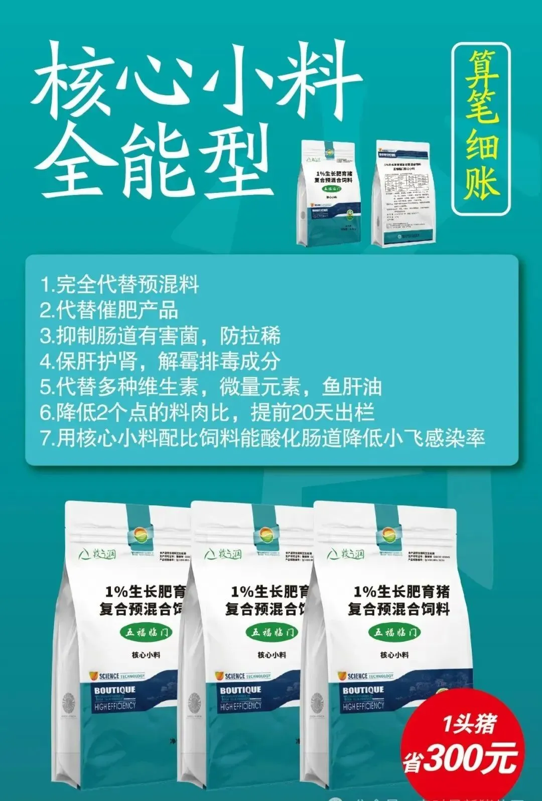 核心预混小料––最终成本平均划到1.3元一斤料!!并且提前20天出栏!从断奶到出栏所有养殖成本可控制在6元以内!真正的降本增效核心产品!